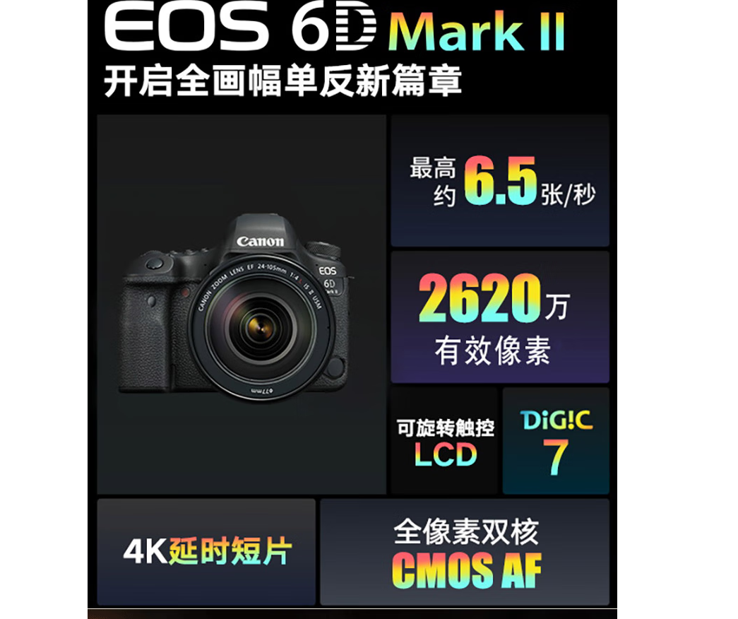 佳能/CANON EOS 6D Mark II 6D2单反相机 全画幅 专业单反相机 L级24-105标准镜头套装(约2620万像素/4K延时视频短片)