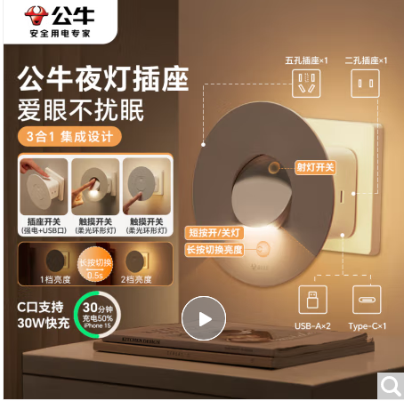 公牛/BULL GN-94021U 插座 30W PD苹果快充卧室小夜灯 床头灯射灯转换插头/一转二USB插座/无线转换插座