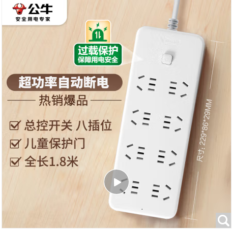 公牛/BULL GN-B2080 插座 超功率保护 新国标插座/插线板/插排/排插/接线板/拖线板 8位总控开关全长1.8米 防过载