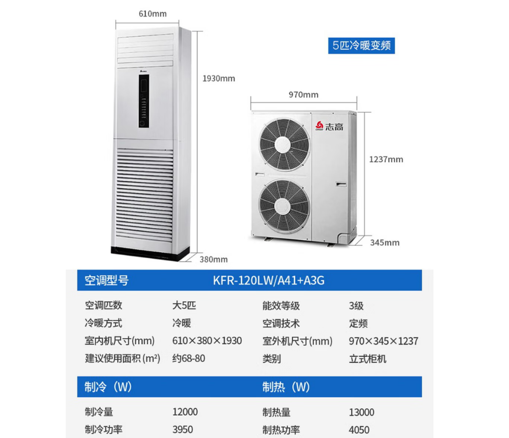 志高/CHIGO 380v KFR-120/A41 柜式空调 空调柜机大三3/2匹5匹及以上立式圆柱方柜机客厅厂房节能静音新能效 纯铜管包基础安装 大5匹冷暖380v KFR-120/A41新三级