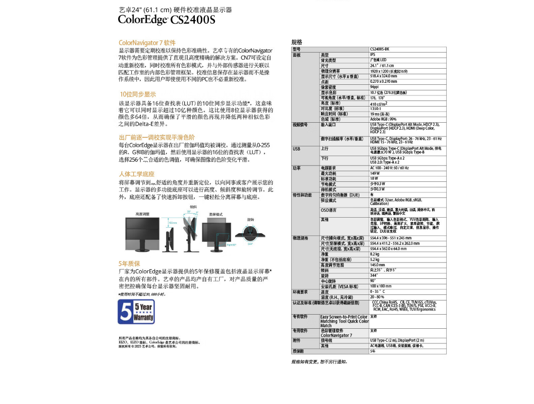 艺卓/EIZO CS2400S 液晶显示器 广色域 硬件校准 摄影修图后期制作 工业监控图像显示屏 24.1英寸黑色