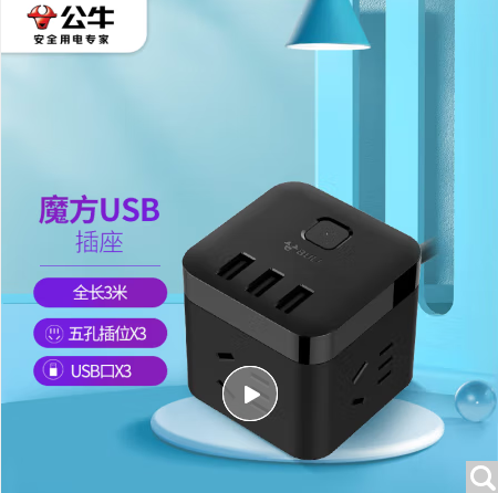 公牛/BULL GN-U303H 插座 魔方USB插座 插线板/插排/排插/接线板/拖线板 3USB接口+3插孔全长3米 黑色