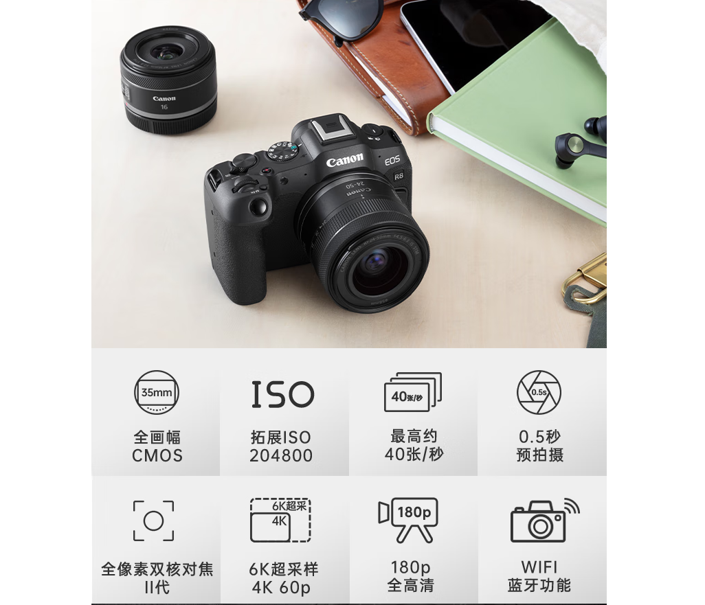 佳能/CANON EOS R8 单电/微单相机 全画幅微单数码相机 RF24-50镜头套装(约2420万像素/小型轻量)